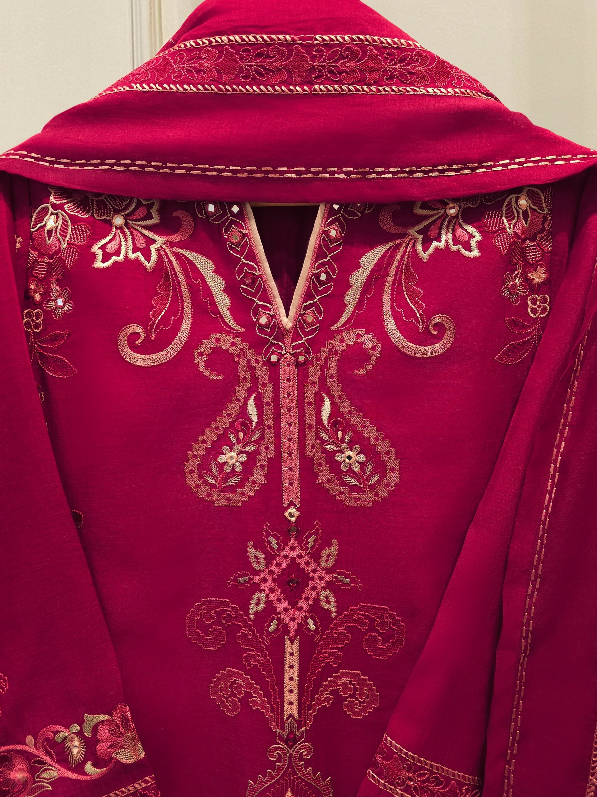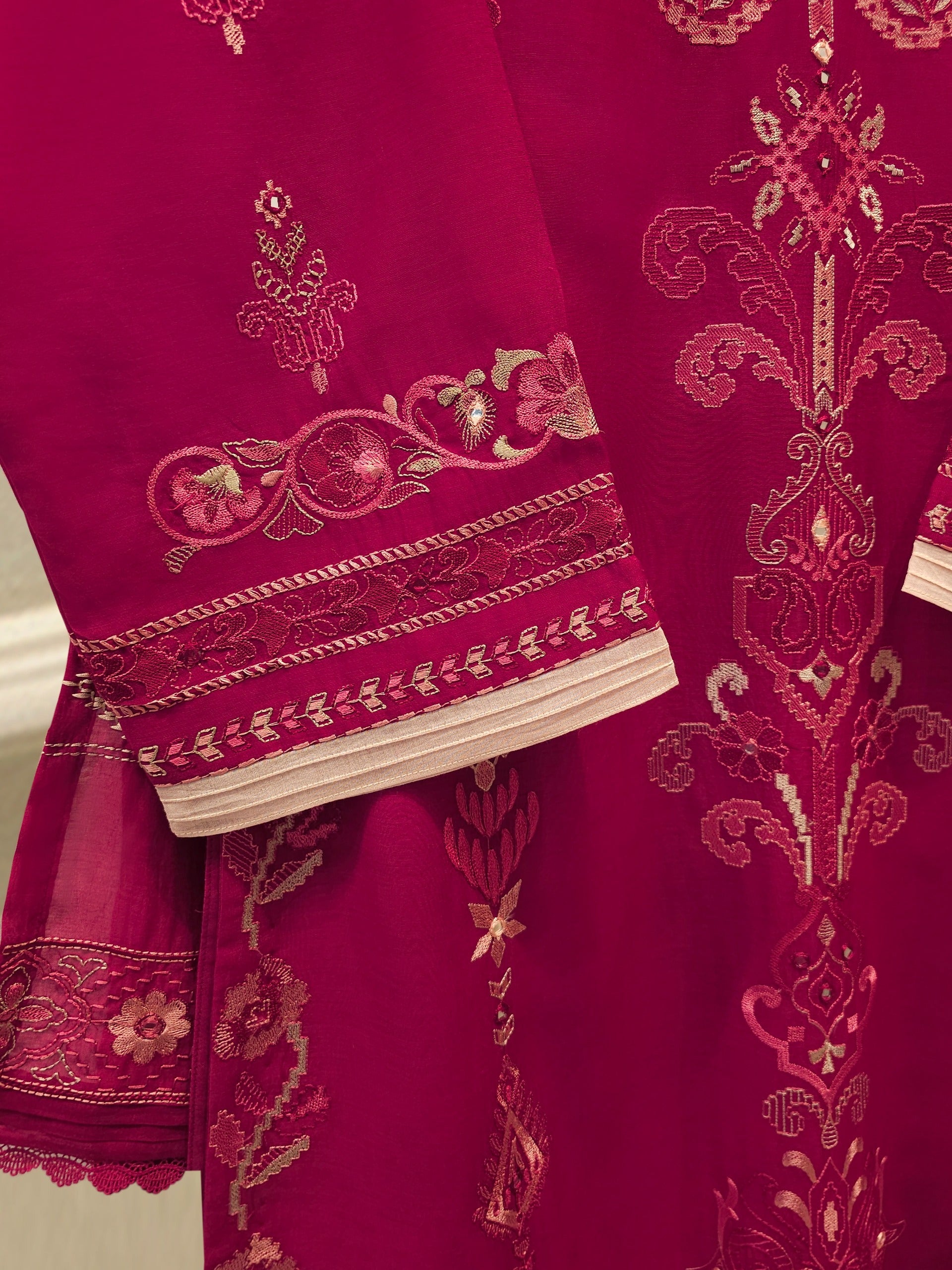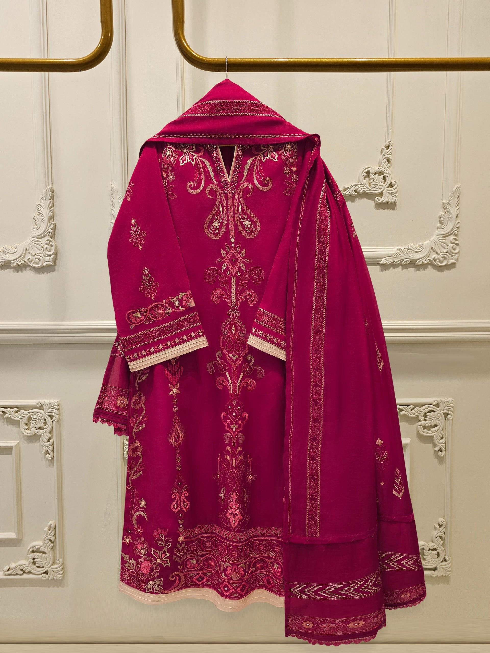 Elevate your summer wardrobe with this beautifully crafted red kora cotton shirt, featuring intricate Chikan Kari work on the sleeves and daman. Designed for timeless elegance, this piece blends breathable lawn fabric with traditional craftsmanship, perfect for festive occasions or casual sophistication. Pair it with pants for a complete look.