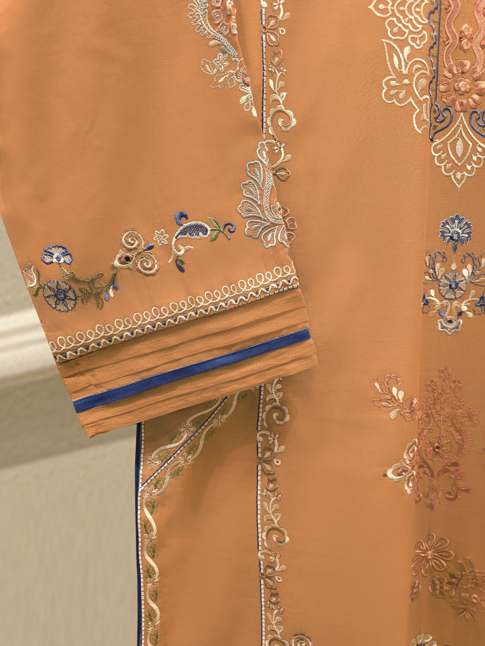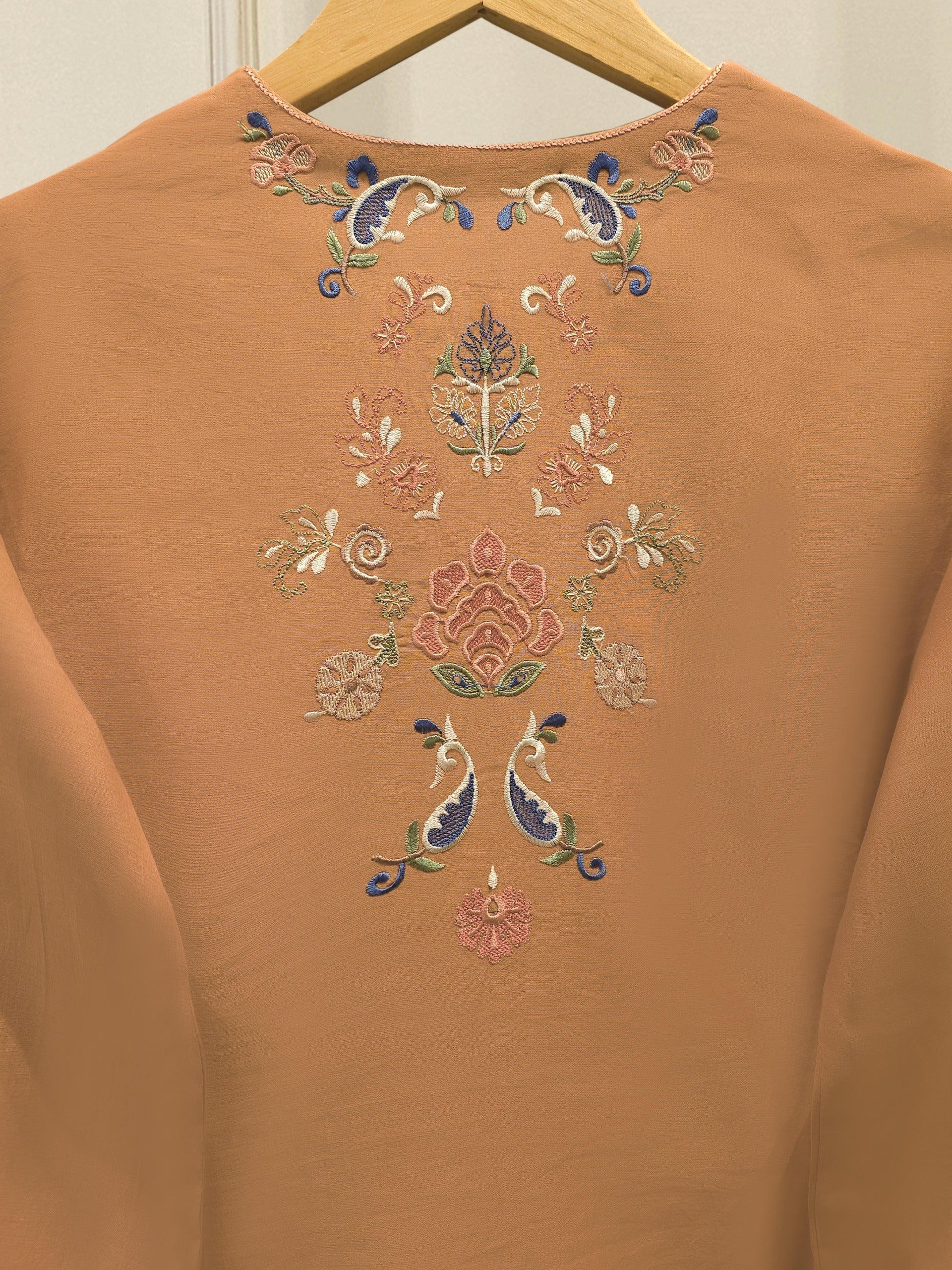 Elevate your summer wardrobe with this beautifully crafted brown kora cotton shirt, featuring intricate Chikan Kari work on the sleeves and daman. Designed for timeless elegance, this piece blends breathable lawn fabric with traditional craftsmanship, perfect for festive occasions or casual sophistication. Pair it with pants for a complete look.