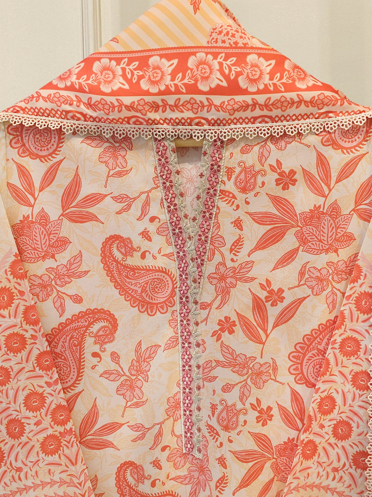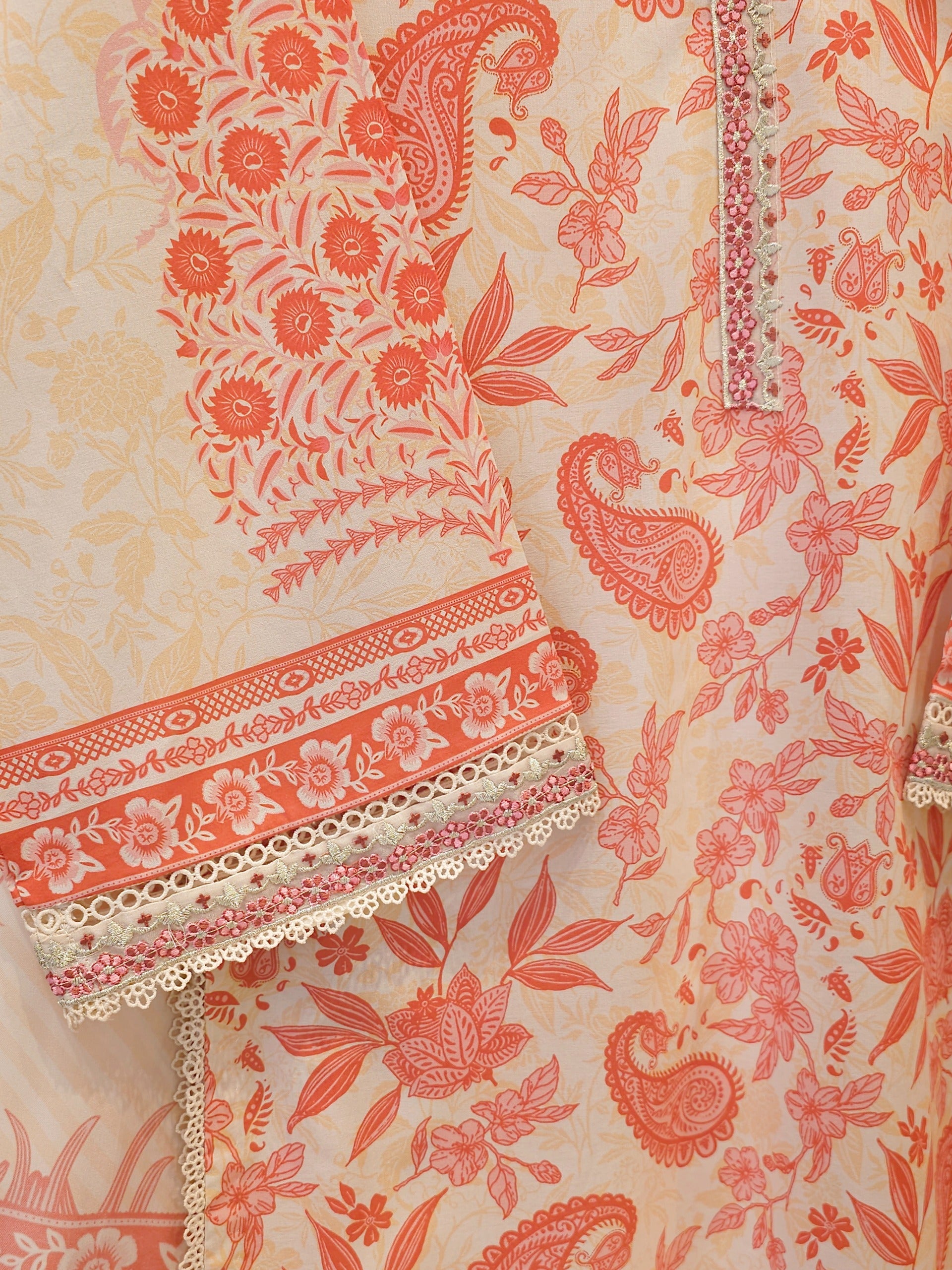 Elevate your summer wardrobe with this beautifully crafted peach lawn shirt, featuring intricate Chikan Kari work on the sleeves and daman. Designed for timeless elegance, this piece blends breathable lawn fabric with traditional craftsmanship, perfect for festive occasions or casual sophistication. Pair it with dupatta for a complete look.