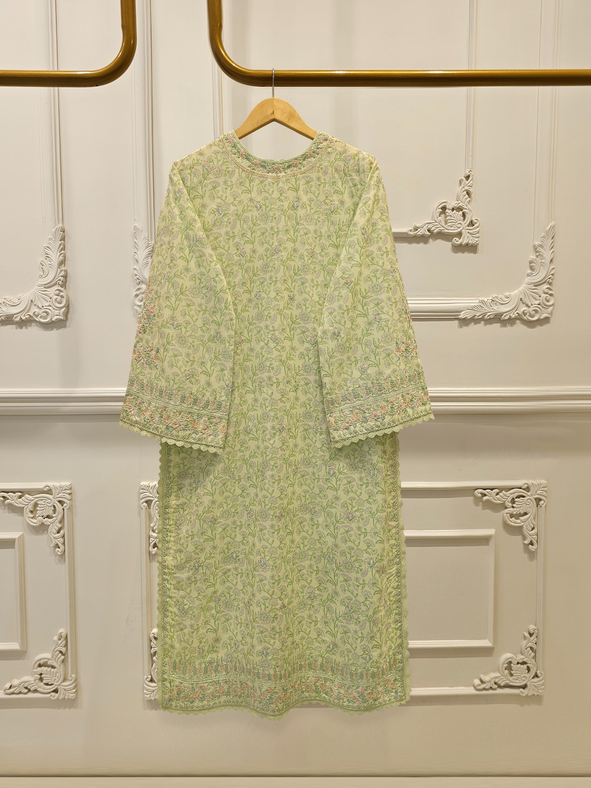 Elevate your summer wardrobe with this beautifully crafted pista green cambric shirt, featuring intricate Chikan Kari work on the sleeves and daman. Designed for timeless elegance, this piece blends breathable lawn fabric with traditional craftsmanship, perfect for festive occasions or casual sophistication. Pair it with pants for a complete look.