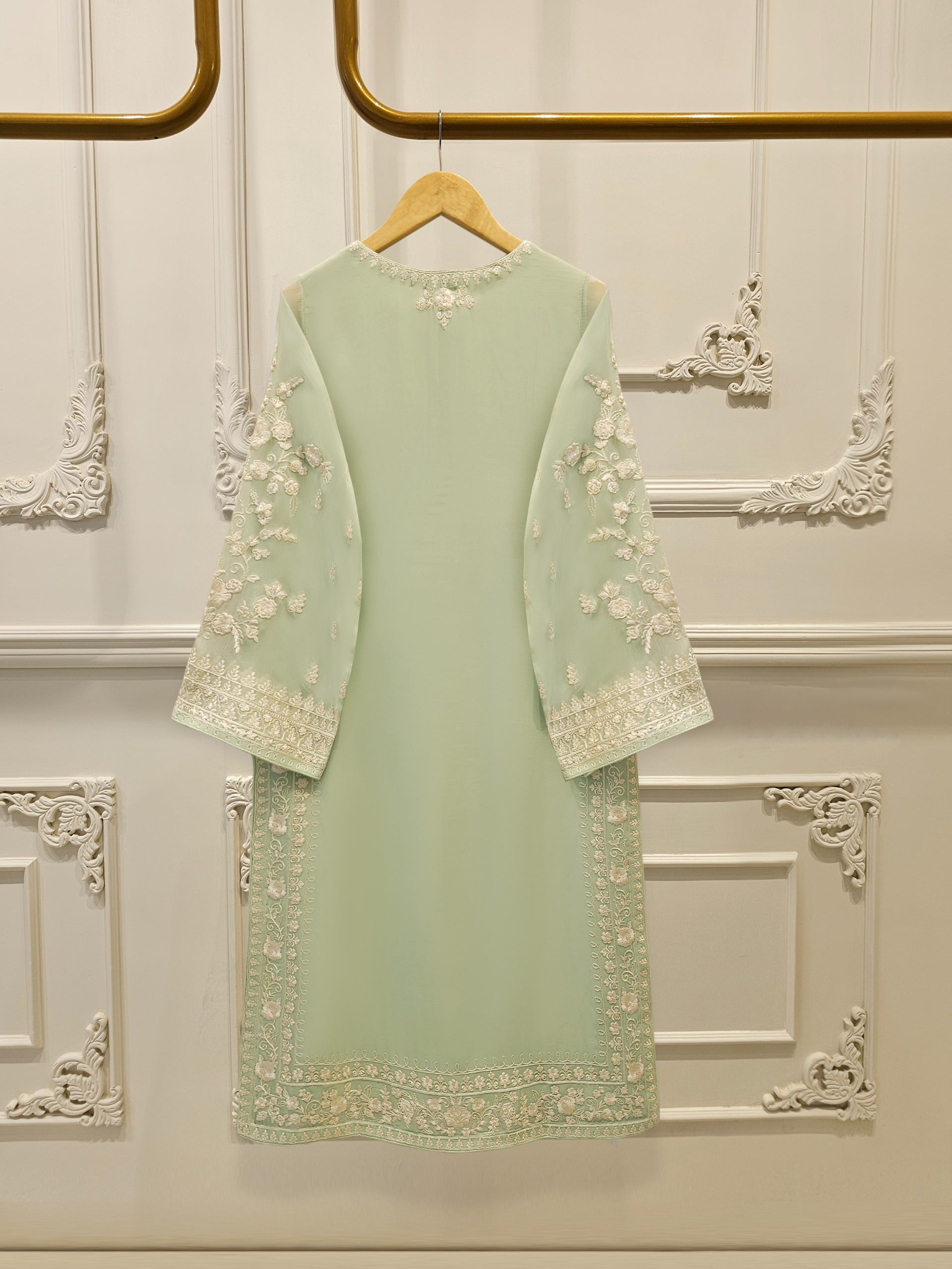 Elevate your style with our pista green embroidered chiffon straight shirt crafted with utmost care and attention to detail. The shirt features intricate embroidery on the front and sleeves, adding a touch of timeless charm.