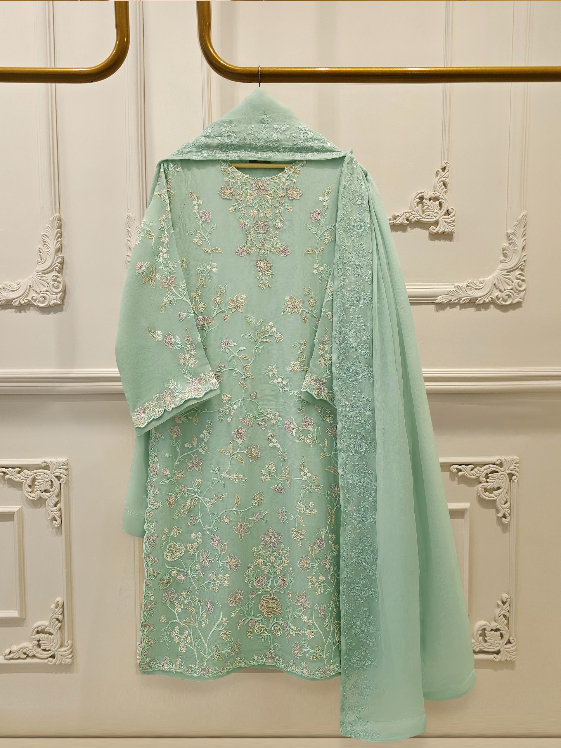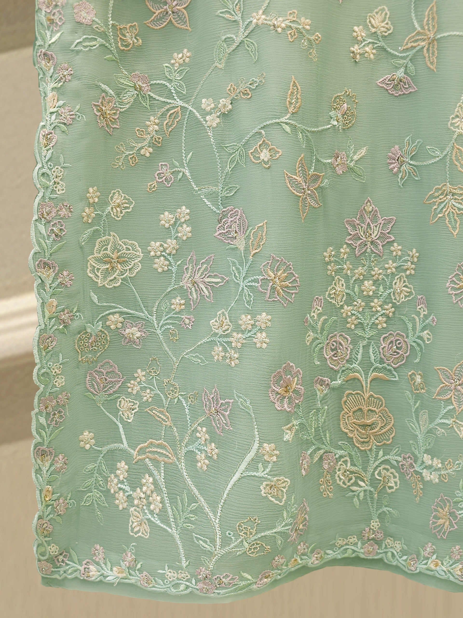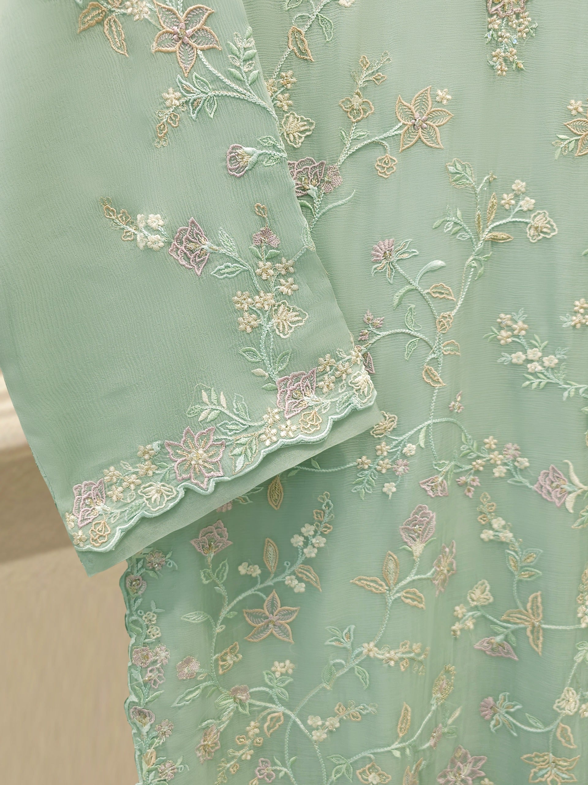 Elevate your style with our sea green embroidered pure chiffon straight shirt crafted with utmost care and attention to detail. The shirt features intricate embroidery on the front and sleeves, adding a touch of timeless charm.