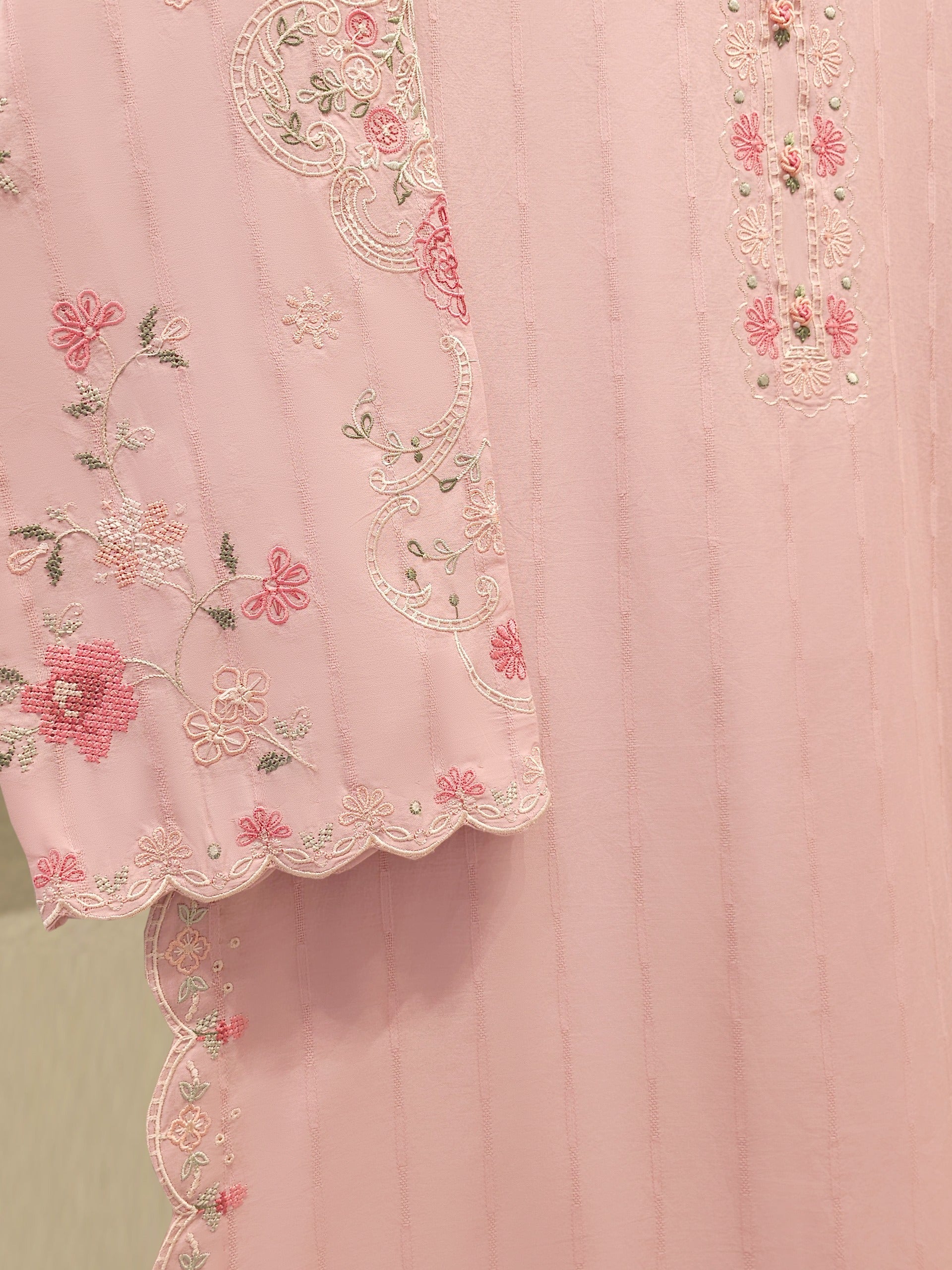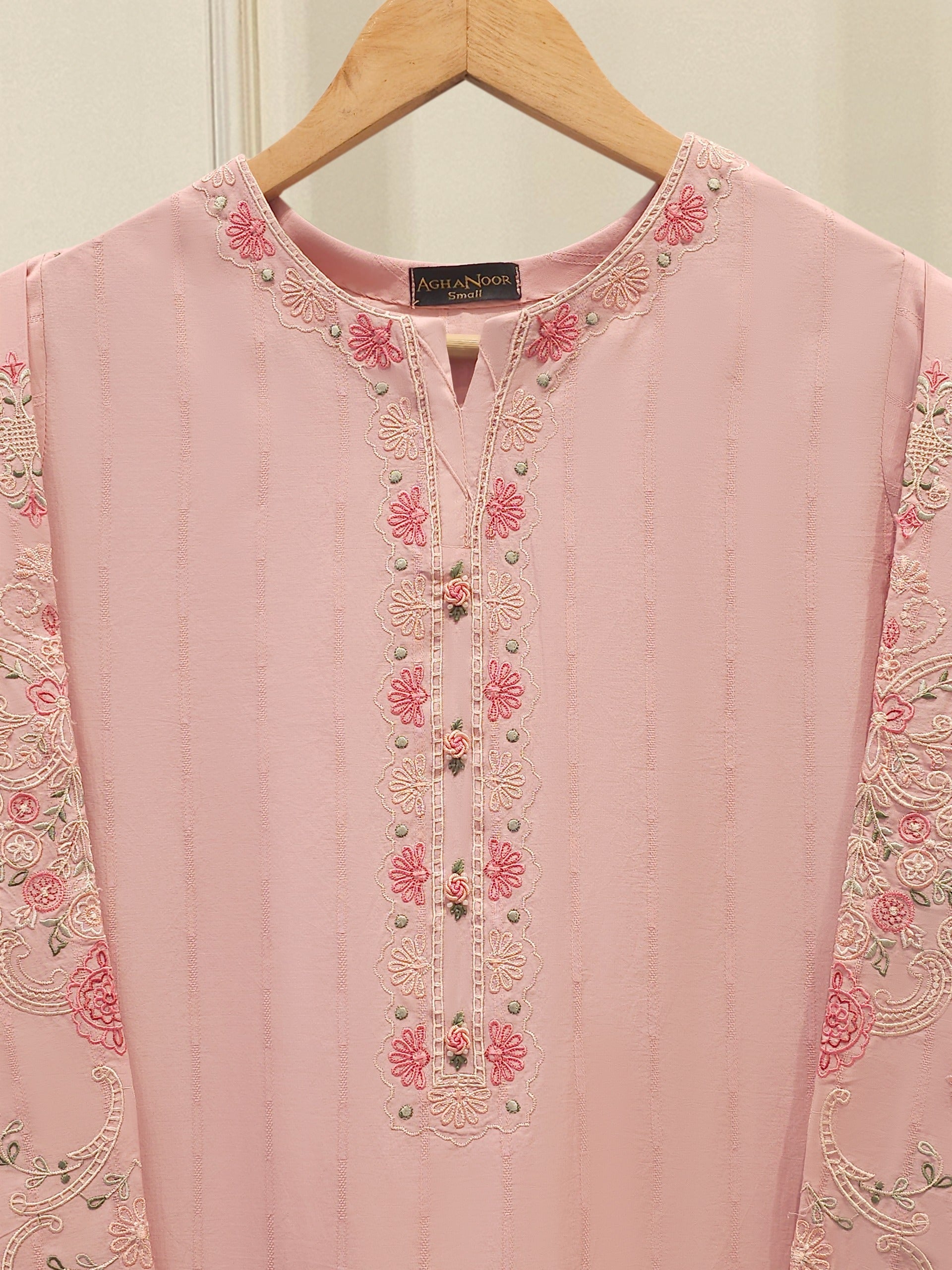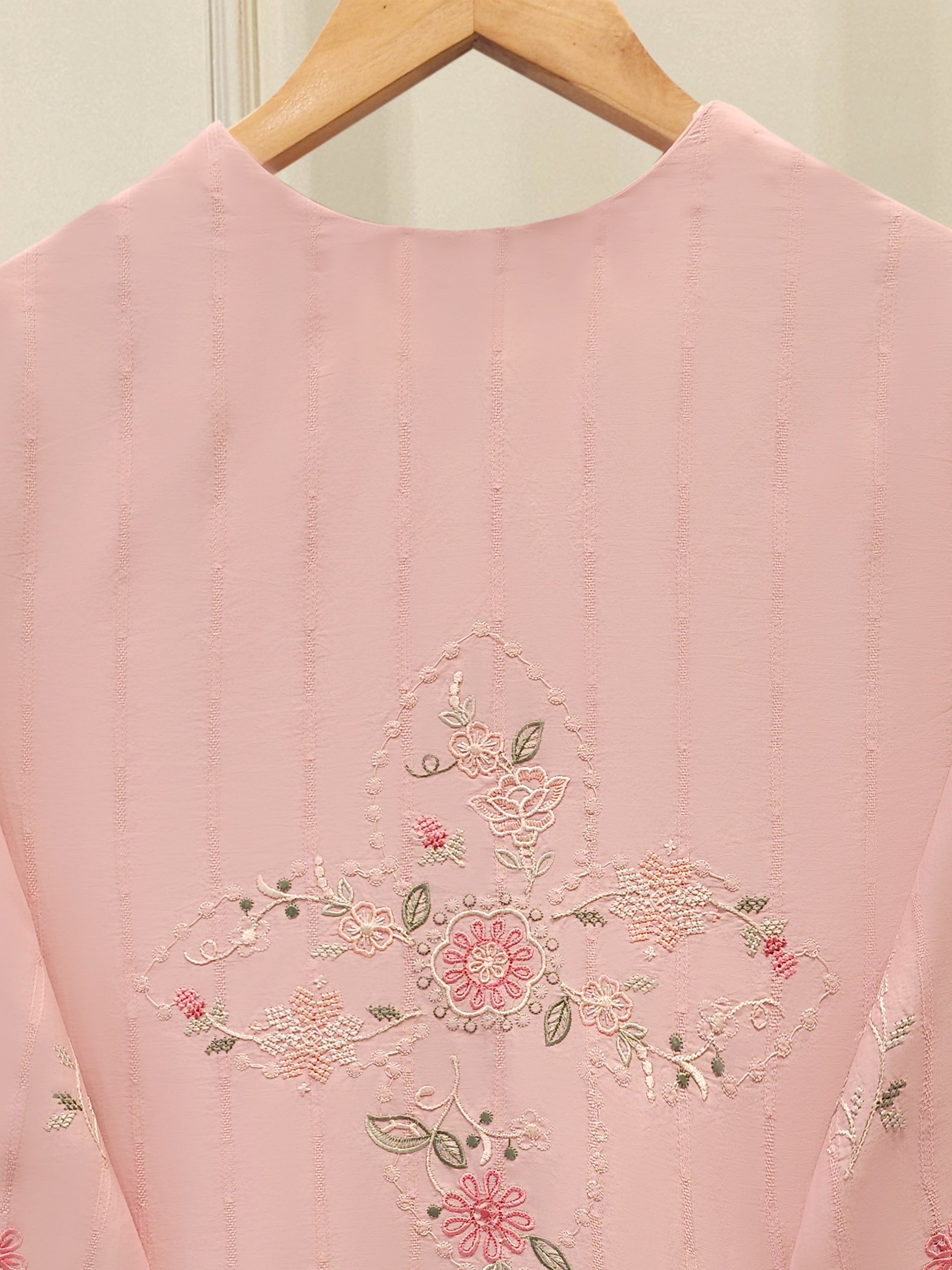 Elevate your summer wardrobe with this beautifully crafted pink Embroidered Jacquard Shirt S112191shirt, featuring intricate Chikan Kari work on the sleeves and daman. Designed for timeless elegance, this piece blends breathable lawn fabric with traditional craftsmanship, perfect for festive occasions or casual sophistication. Pair it with pants for a complete look.