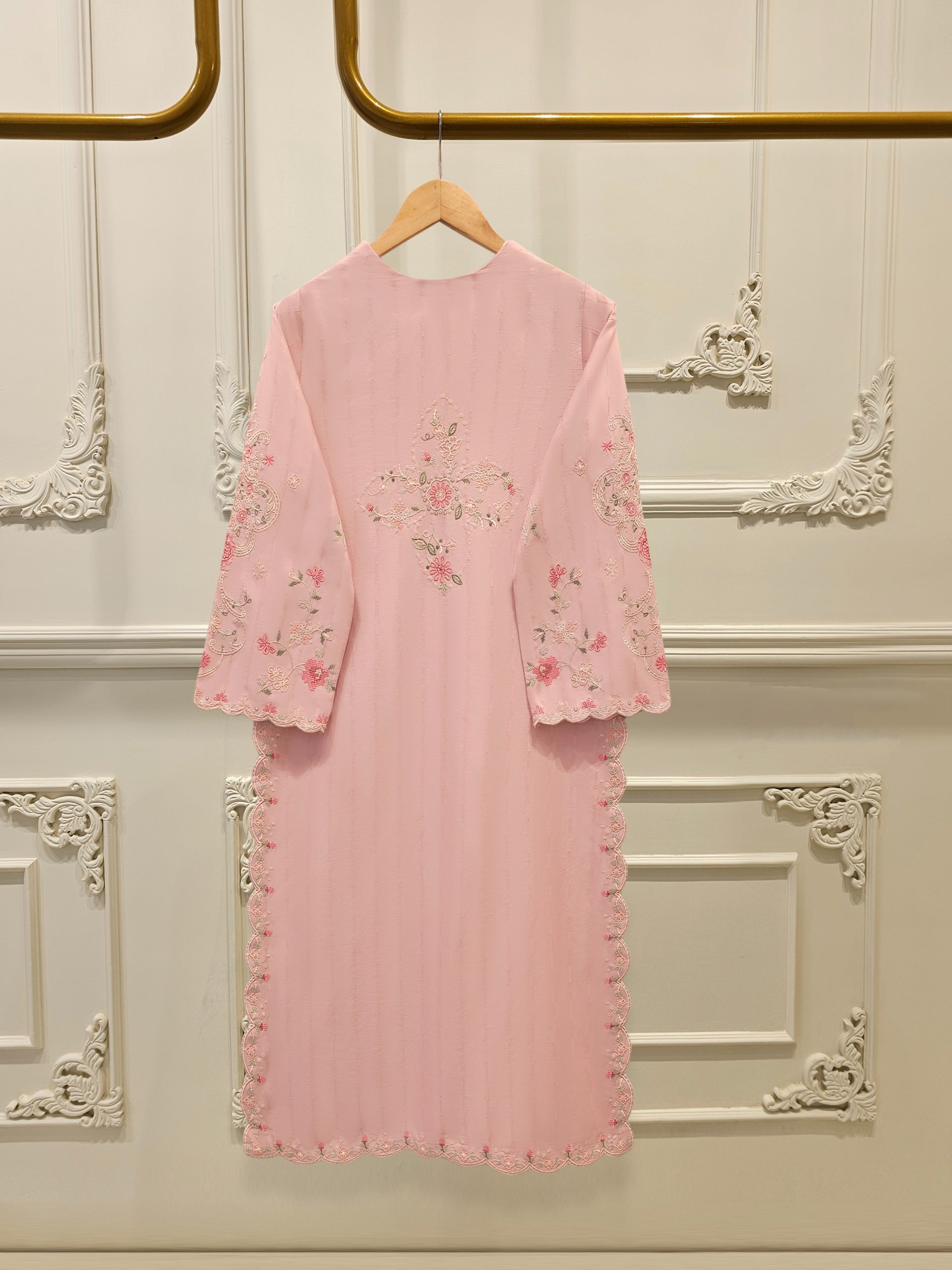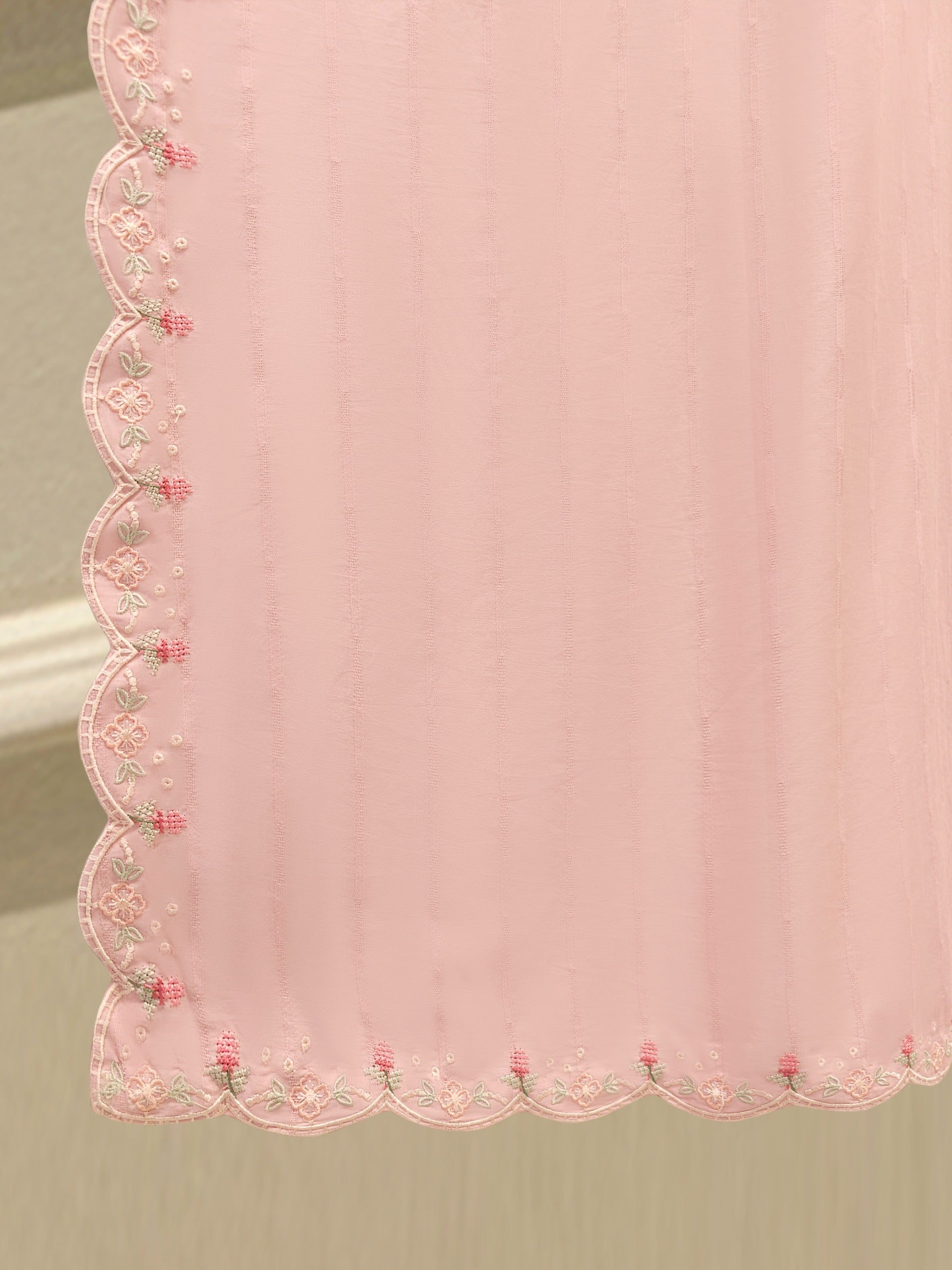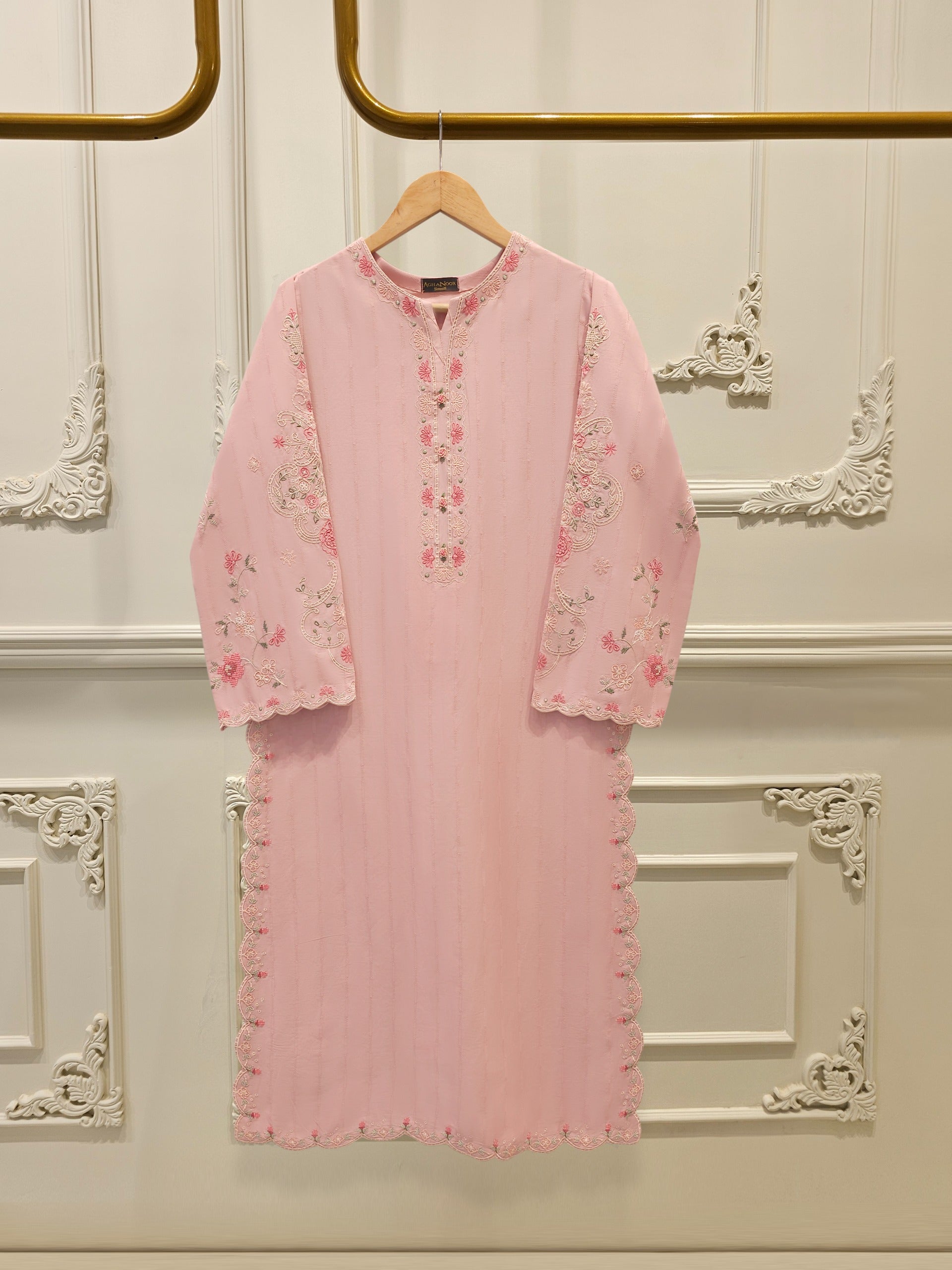 Elevate your summer wardrobe with this beautifully crafted pink Embroidered Jacquard Shirt S112191shirt, featuring intricate Chikan Kari work on the sleeves and daman. Designed for timeless elegance, this piece blends breathable lawn fabric with traditional craftsmanship, perfect for festive occasions or casual sophistication. Pair it with pants for a complete look.